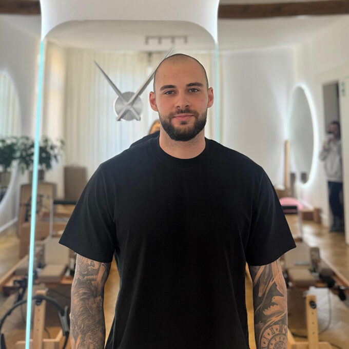 As a Pilates instructor, he patiently and enthusiastically guides clients,